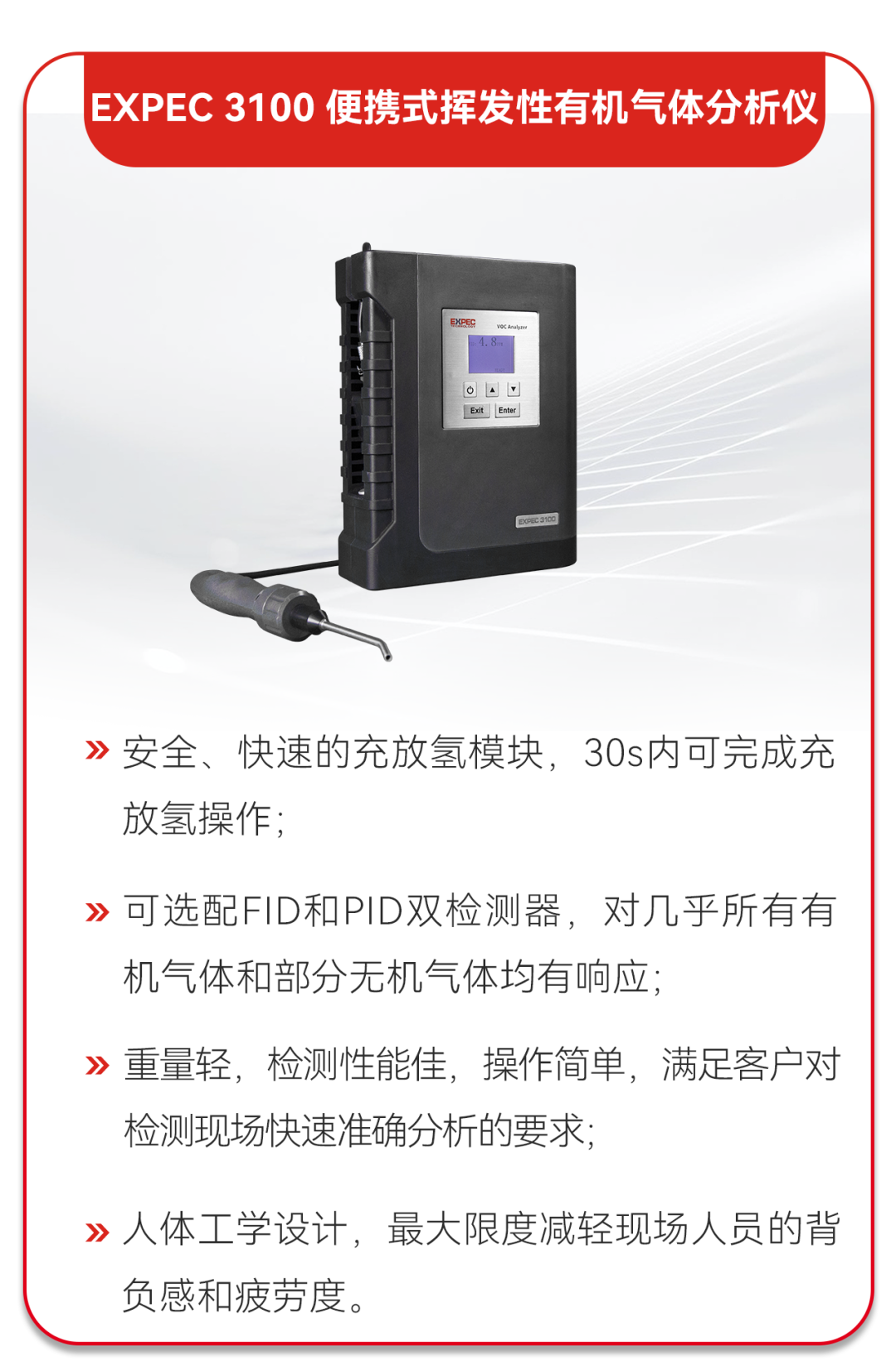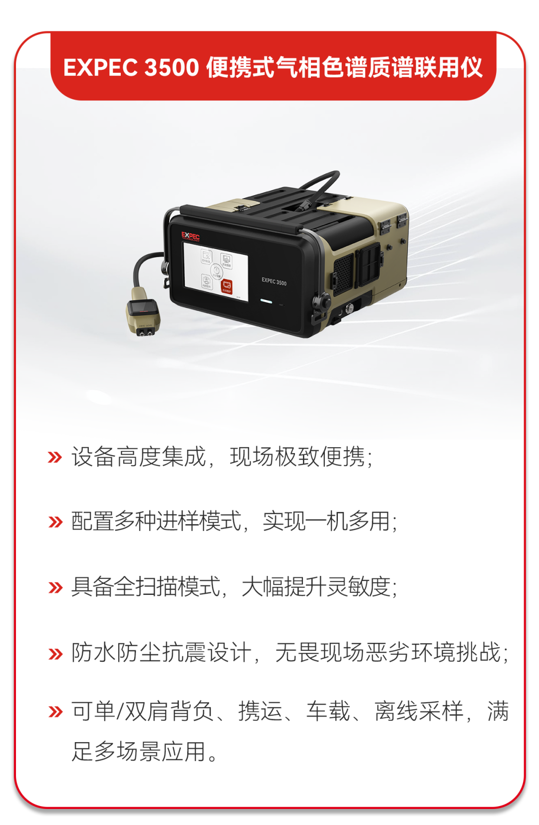 聚光科技化工园区便携式VOCs检测技术为化工园区实施VOCs污染精细化管控及环境突发应急监测提供科技支撑保障。该检测技术主要由EXPEC 3100便携式挥发性有机气体分析仪和EXPEC 3500便携式气相色谱-质谱联用仪组成,助力园区管理部门实现对低挥发性有机物(VOCs)的自主监测,能有效满足环境VOCs监测设备“科技化、精准化、智慧化”需求,提升监测效能,为保障空气质量提供强有力支撑。