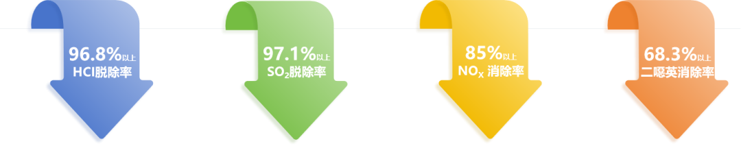 HCl脱除率在96.8%以上,SO2脱除率在97.1%以上;自研催化陶瓷滤筒脱硝对烟气中NOX的消除率在85%以上,二噁英消除率在68.3%以上;中试装置出口的二噁英和重金属排放值均小于GB18485规定的排放限值。