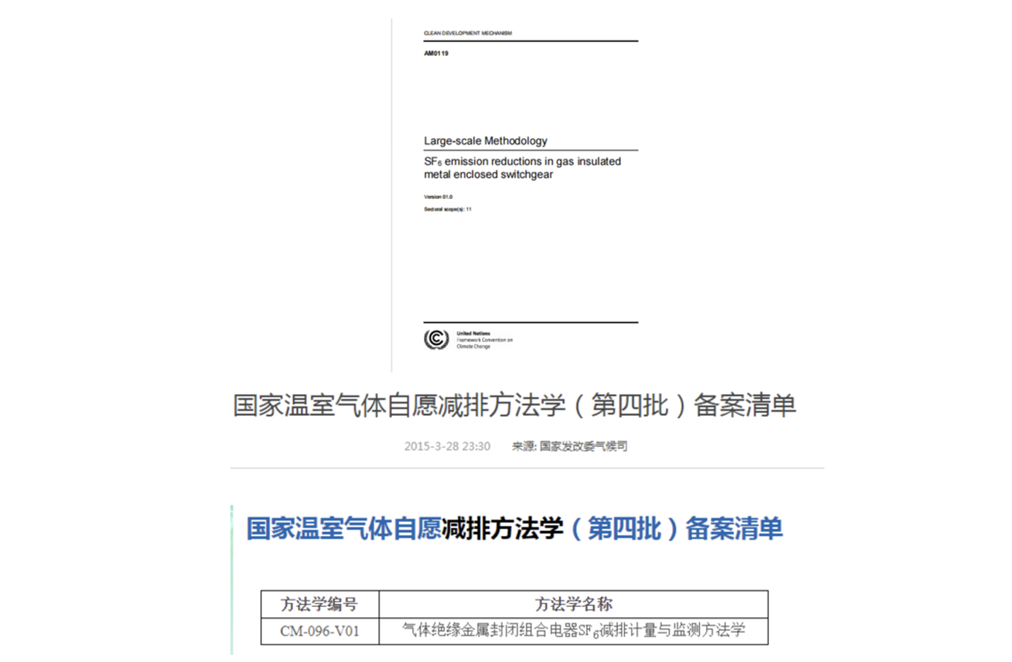 2014年4月,由华德海泰电器为主开发的“气体绝缘金属封闭组合电器SF6减排计量与监测方法学”经国家发改委组织专家评估,予以备案作为国家温室气体自愿减排方法学(编号:CM-096-V01)。2017年4月,该方法学又获得联合国气候变化框架公约(UNFCCC)清洁发展机制(CDM)批准(编号:AM0119)。