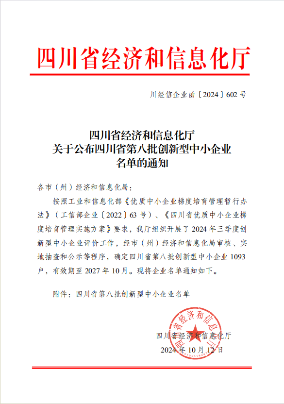 近日,四川省经济和信息化厅公布了四川省第八批创新型中小企业名单,铁建公司凭借突出表现,成功获得创新型中小企业称号。