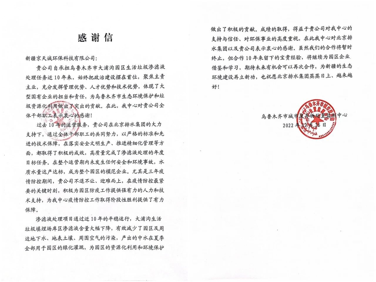 承担乌鲁木齐市大浦沟园区生活垃圾渗滤液处理任务10年来,新疆京天诚公司始终把政治建设摆在首位,聚焦主责主业,充分发挥北京排水集团技术、管理和人才优势,为乌鲁木齐市生态环境保护和垃圾资源化利用做出突出贡献,成为园区模范企业,体现了国企责任与担当。相关工作获得了乌鲁木齐市城市废弃物处置监测中心高度评价,并致以感谢信。