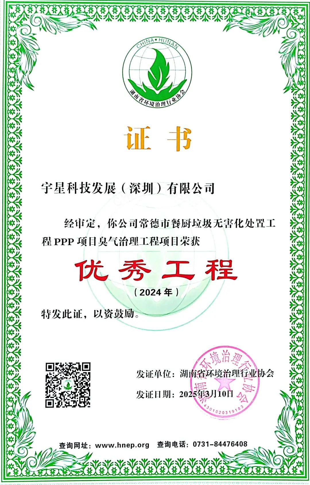 宇星科技发展(深圳)有限公司承担的常德市餐厨垃圾无害化处置工程ppp项目臭气治理工程项目荣获湖南省环境治理行业协会2024年度“湖南环境治理优秀工程”。