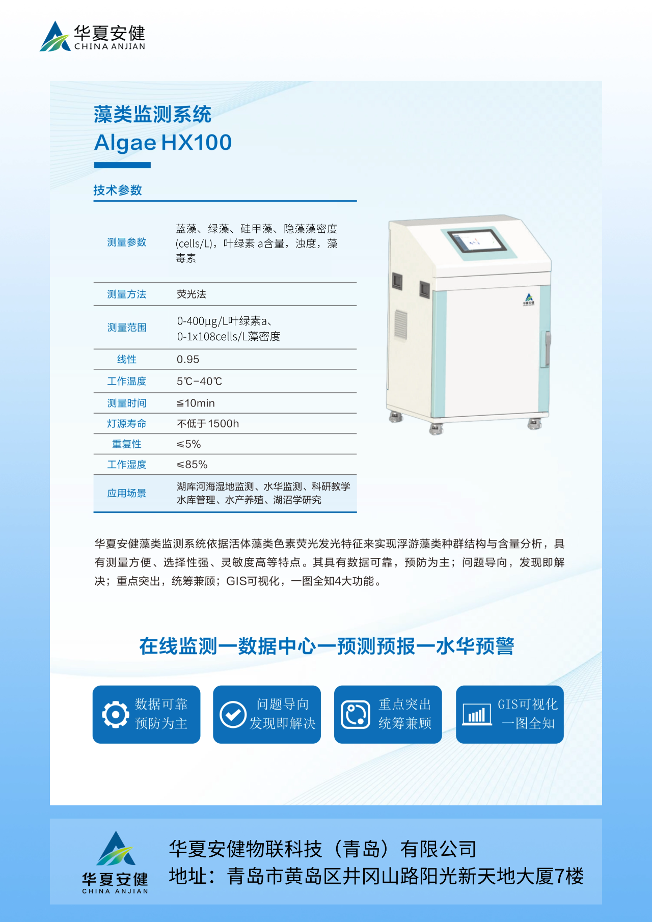 藻类监测系统是华夏安健基于三维荧光技术研发落地的又一环保高端设备,能够广泛应用于湖库河海湿地监测、水华监测、科研教学、水库管理、水产养殖及湖沼学研究等多个领域,具备以下四大功能: