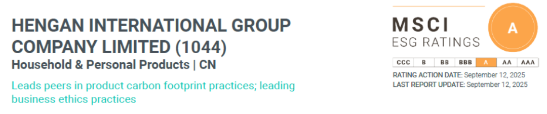 近日,国际权威指数机构明晟(MSCI)公布了恒安国际集团有限公司(股份代号:1044.HK)2025年度最新环境、社会及治理(ESG)评级结果。凭借在可持续发展方面的优异表现,恒安国际的评级由“BBB”级跃升至“A”级,在中国家庭及个人用品行业位列第一,标志着集团可持续发展能力获得国际权威认可。