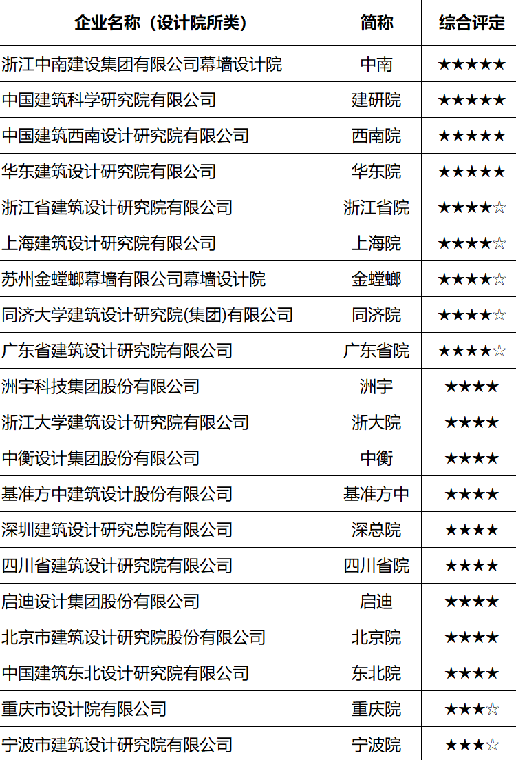 全国建筑幕墙设计及顾问咨询行业“TOP”20榜单