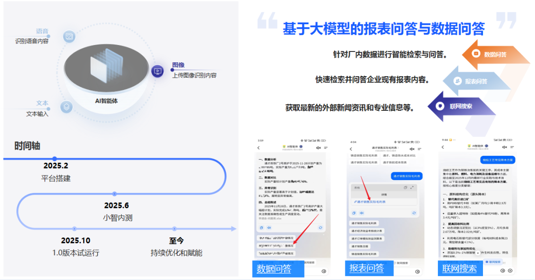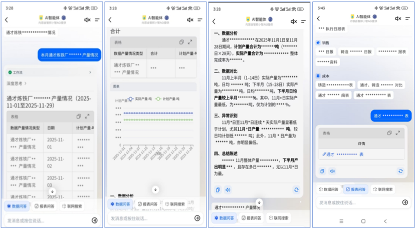 面对企业数千张标准报表,无需层层翻阅、反复切换页面。只需像文字或语音提出需求——“上月通才钢铁产量情况?”“轧材厂成本情况?”系统即可秒级识别用户意图,精准匹配并展示对应报表内容,实现“所想即所得”。