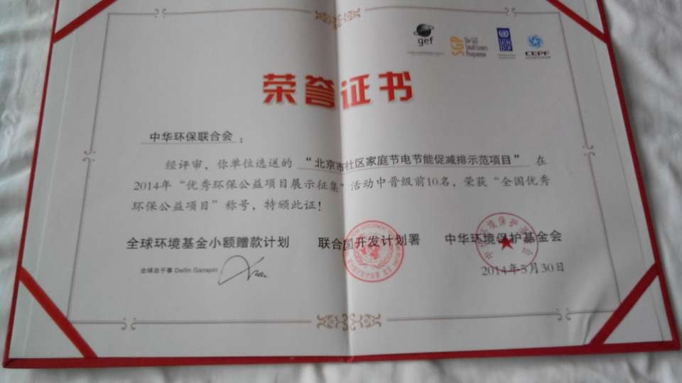 4月18日,联合国开发计划署、全球环境基金、中华环保基金会、江苏省环保联合会在全国范围内举办2014年“优秀环保公益项目展示征集活动”。我会申报的“北京市社区家庭节电节能促减排示范项目”(简称“北京社区示范项目”)在该活动中晋级前10名,荣获“全国优秀环保公益项目”称号。