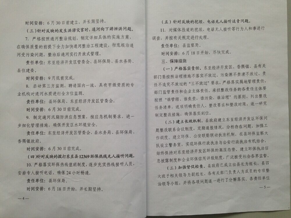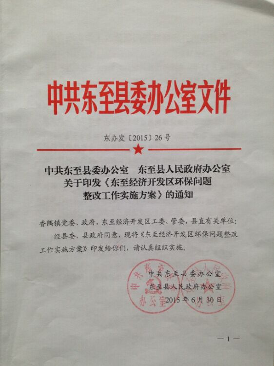 2015年5月,我会联合中央电视台对安徽省池州市东至县香隅化工园环境问题进行了联合调研,调研发现园区排放的工业废水中苯含量超标136倍,对附近的灌溉河道造成污染,并对下游长江的水质安全构成威胁。6月17日,央视《新闻直播间》对该环境问题进行了曝光,引起了当地政府的高度重视,“池州市委市政府要求东至县立即做出整改,园区全部37家企业立即全部自查整改,通河两岸8家涉苯企业立即停产整顿,加快推进园区雨污分流系统治理工程进度,从源头上彻底杜绝污水排放的问题”。7月3日,东至县人民政府向我会发来《东至经济开发区环保问题整改工作实施方案》,方案对经开区环保问题制定了整改目标和具体工作任务完成时序,并落实了保障措施。
