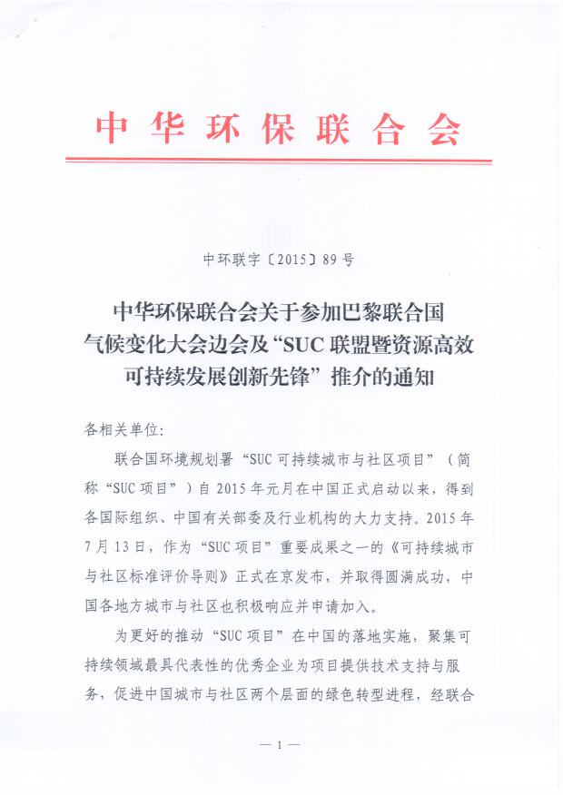 中华环保联合会关于参加巴黎联合国气候变化大会边会及“SUC联盟暨资源高效可持续发展创新先锋”推介的通知
