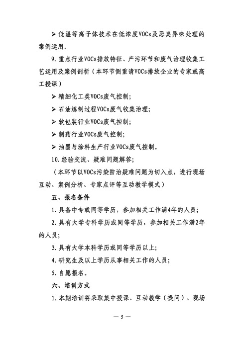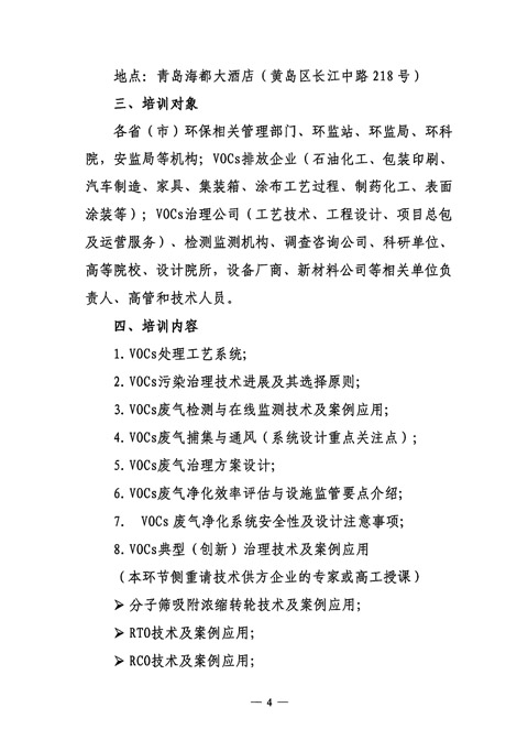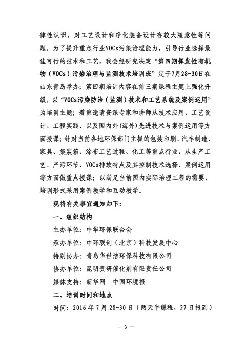 中华环保联合会关于举办“第四期挥发性有机物(VOCs)污染治理与监测技术高级培训班”的通知