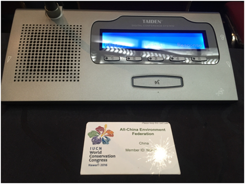 我会行使IUCN会员投票权在会员大会上进行投票(图为投票器与投票卡)