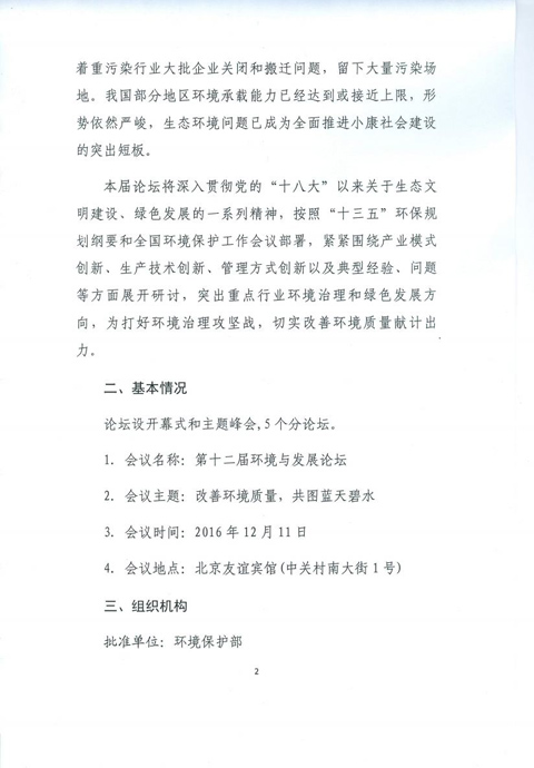 中华环保联合会关于邀请参加第十二届环境与发展论坛的函