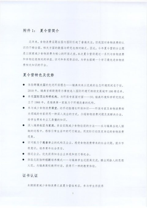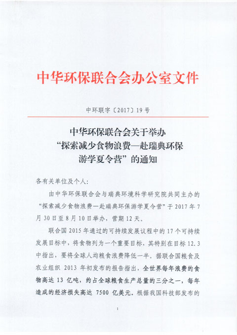 中华环保联合会关于举办“减少食物浪费-赴瑞典环保游学夏令营”的通知