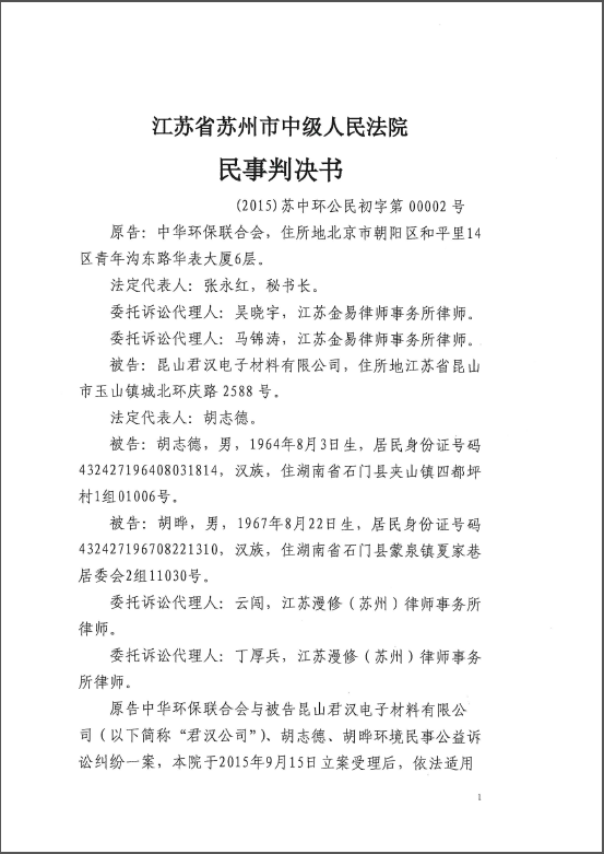 近日,中华环保联合会诉昆山君汉电子材料有限公司等三被告环境污染公益诉讼案在江苏省苏州市中级人民法院正式宣判。被告承担造成环境污染的生态环境修复费用107.9万元,并于判决生效之日起三十日内在《昆山日报》公开向社会公众致歉。