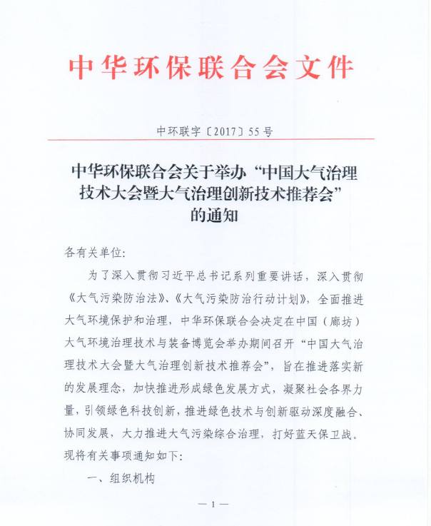 关于举办“中国大气治理技术大会暨大气治理创新技术推荐会”的通知