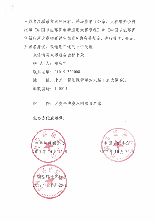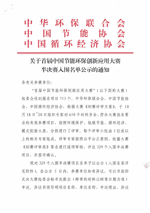 关于首届中国节能环保创新应用大赛 半决赛入围名单公示的通知