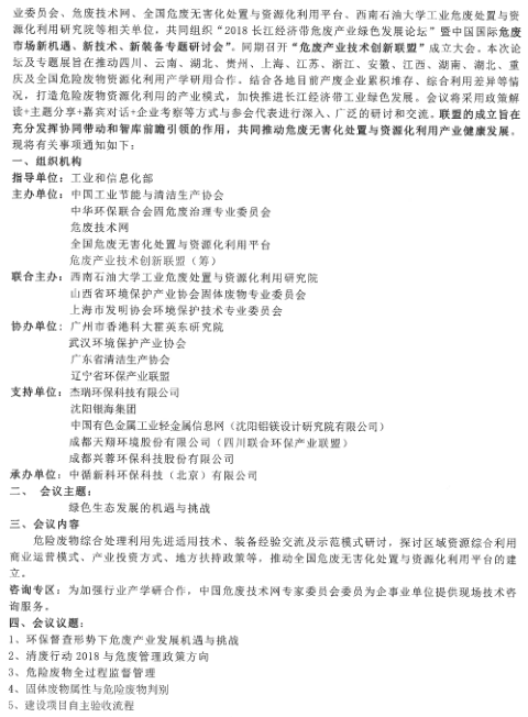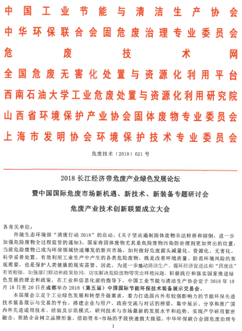 2018长江经济带危废产业绿色发展论坛、危废产业技术创新联盟成立大会