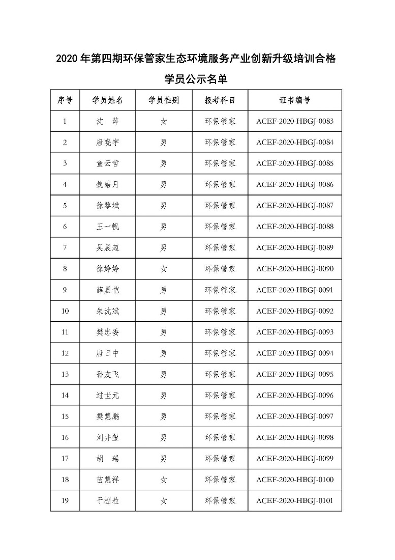 2020年第四期环保管家生态环境服务产业创新升级培训合格学员公示名单