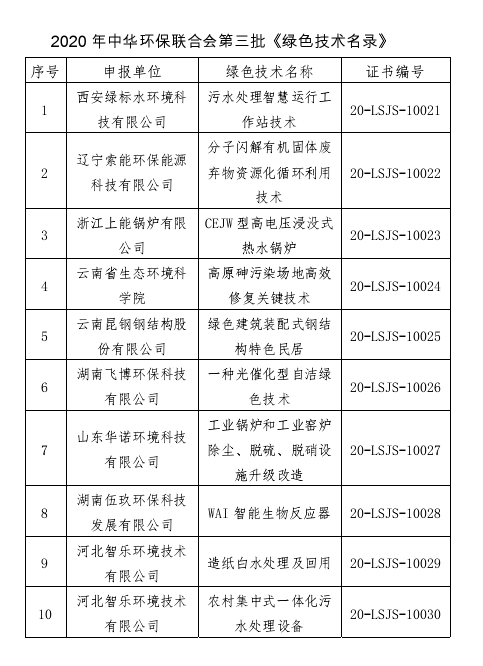 根据申报单位填写的《申报书》及相关文件,我会组织相关专家对申报技术资料进行了评审和考察。经严格评审后,现将第二、三批入选《绿色技术名录》的具体名单公布如下: