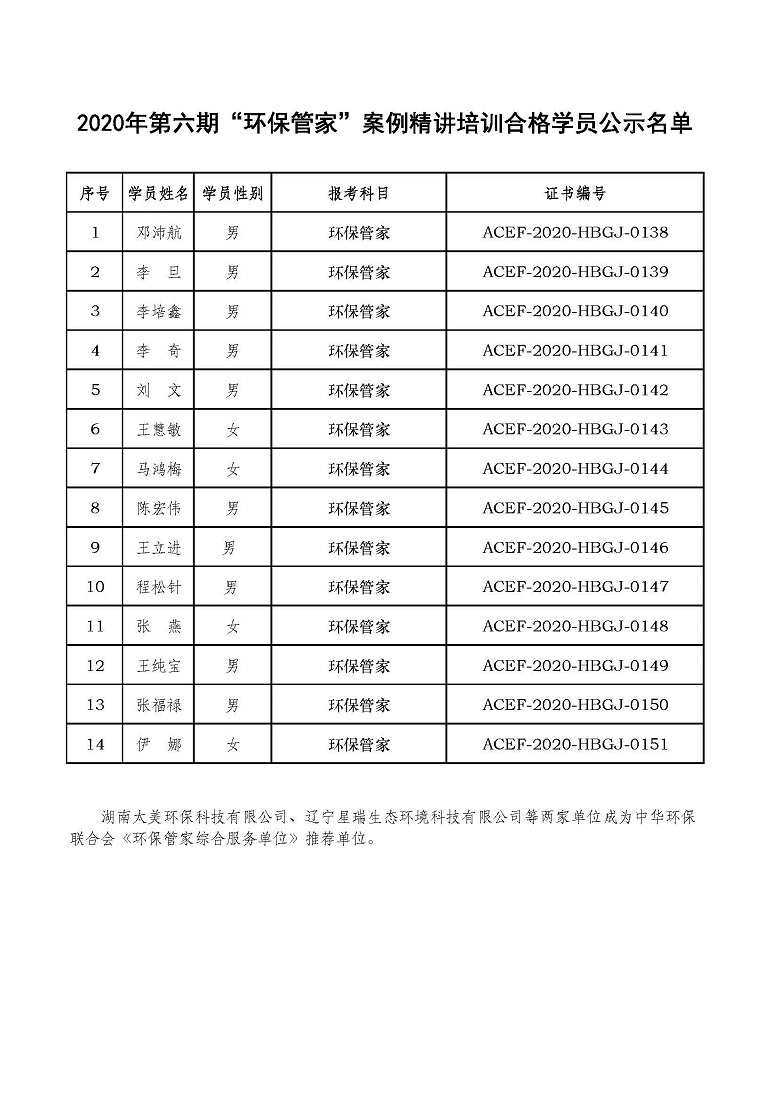 2020年第六期“环保管家”案例精讲培训合格学员公示名单