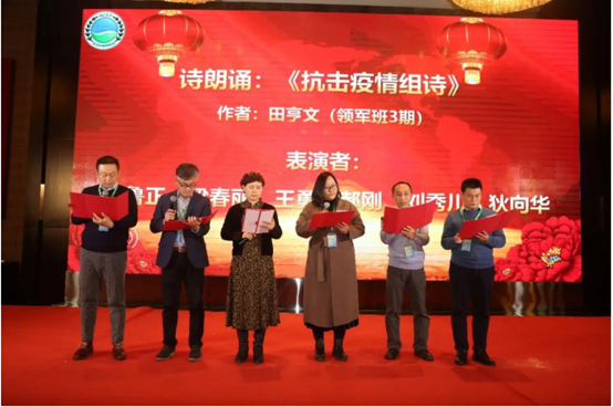 晚会节目中,几位学员庄严的进行了诗朗诵《抗击疫情组诗》,表达了领军班学员对抗击疫情的决心和支持。