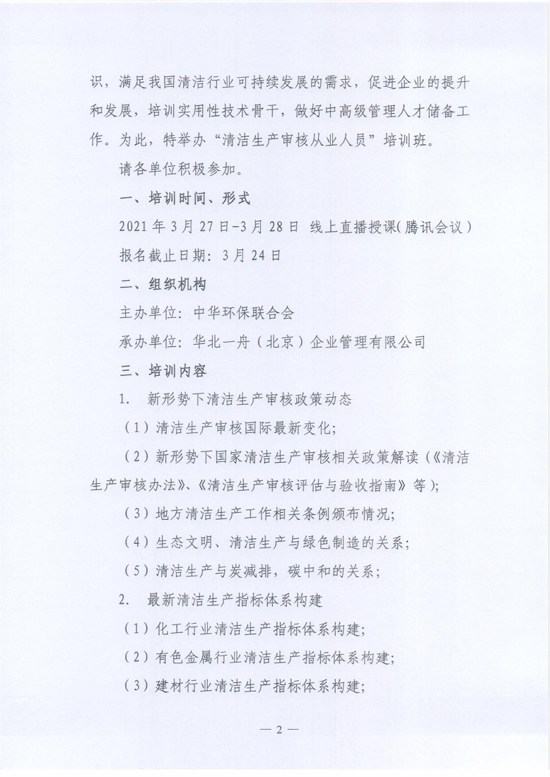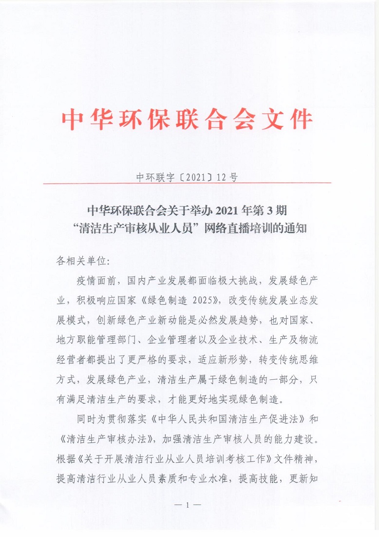 关于举办2021年第3期“清洁生产审核从业人员”网络直播培训的通知