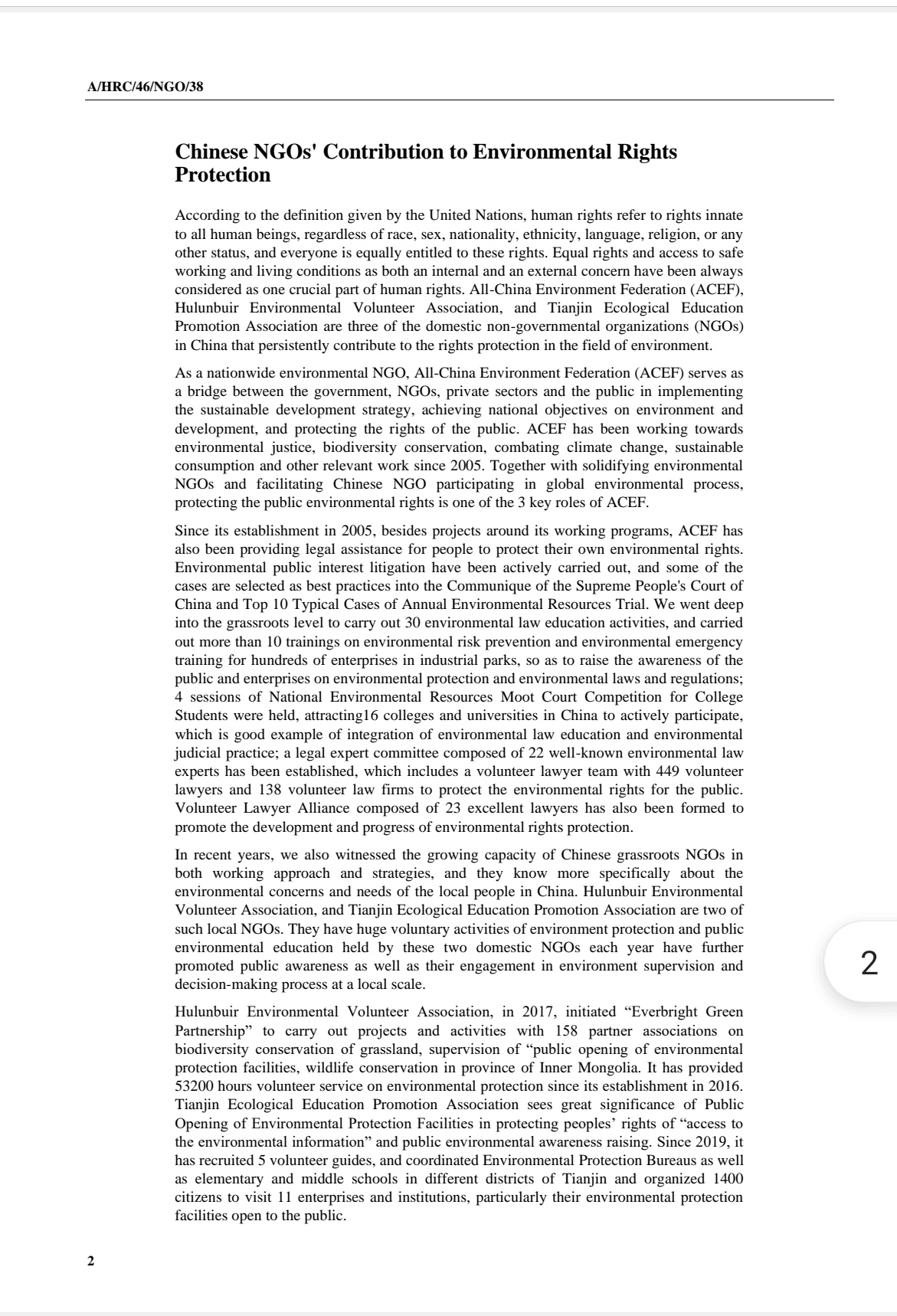 联合国人权理事会第46次会议于2月22日正式召开,会期为2月22日至3月19日。中华环保联合会(All-China Environment Federation),作为拥有联合国经社理事会特别咨商地位的一家全国性环保NGO,注册参加本次大会并于会议前夕向联合国正式提交书面发言。