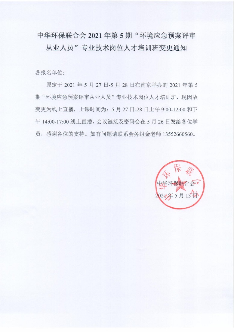 中华环保联合会2021年第5期“环境应急预案评审从业人员”专业技术岗位人才培训班变更通知