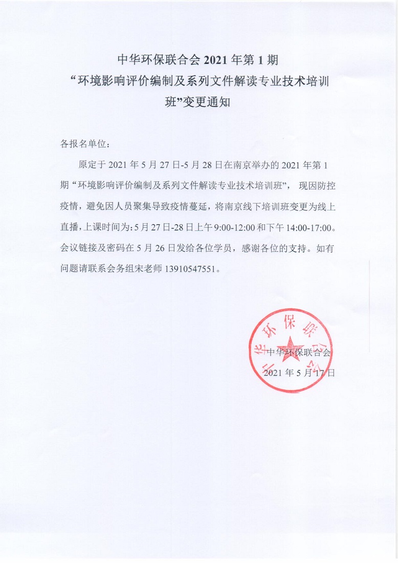 中华环保联合会2021年第1期“环境影响评价编制及系列文件解读专业技术培训班”变更通知