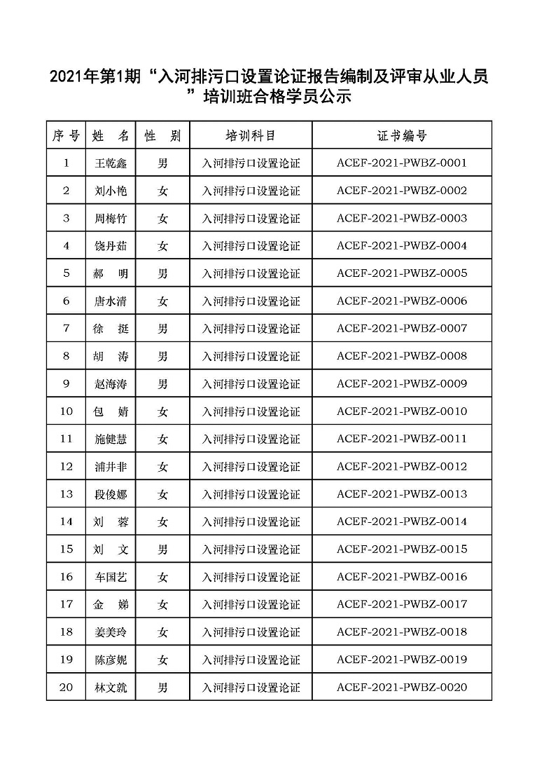 2021年第1期“入河排污口设置论证报告编制及评审从业人员”培训班合格学员公示