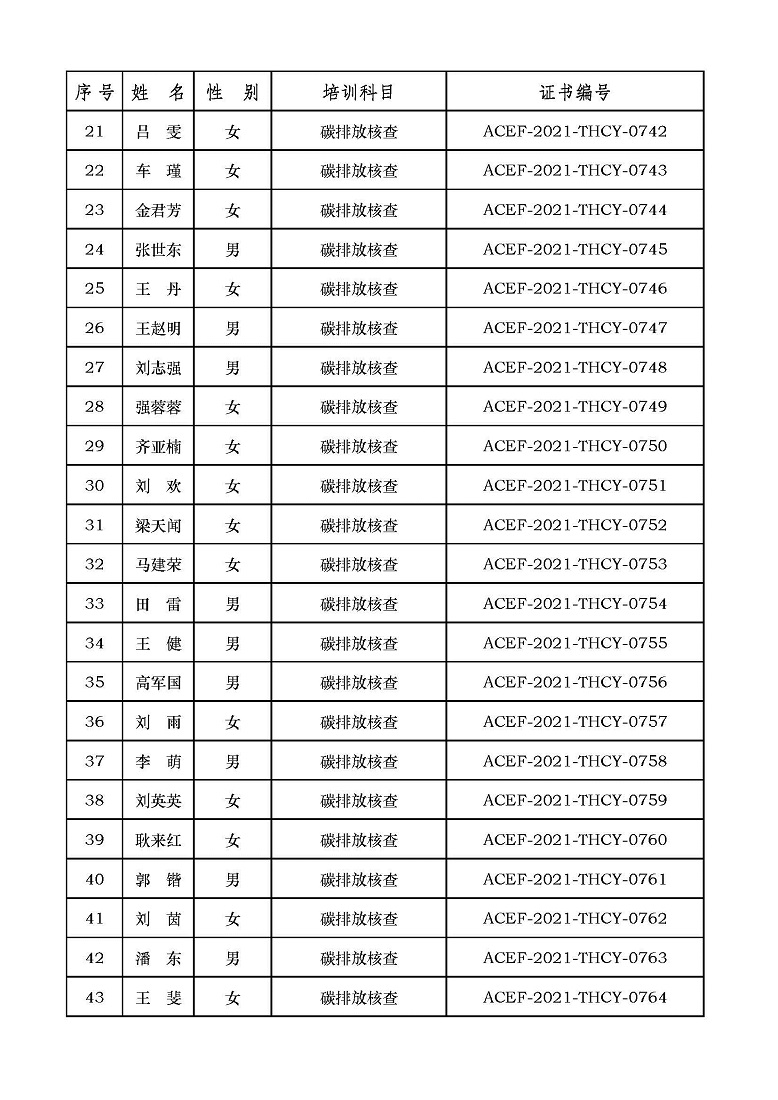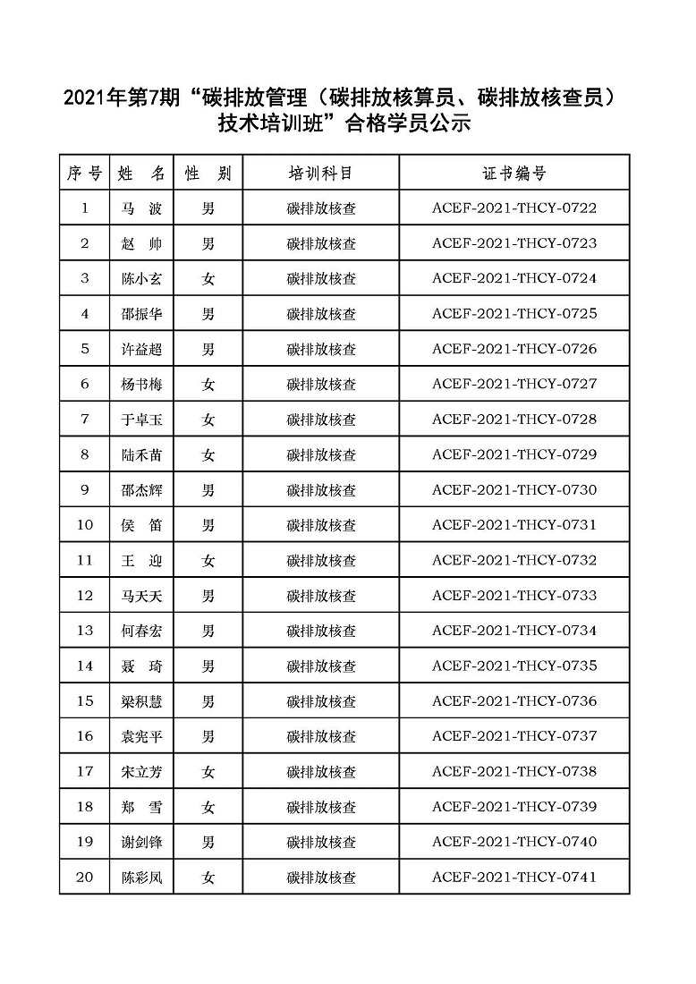 2021年第7期“碳排放管理(碳排放核算员、碳排放核查员)技术培训班”合格学员公示