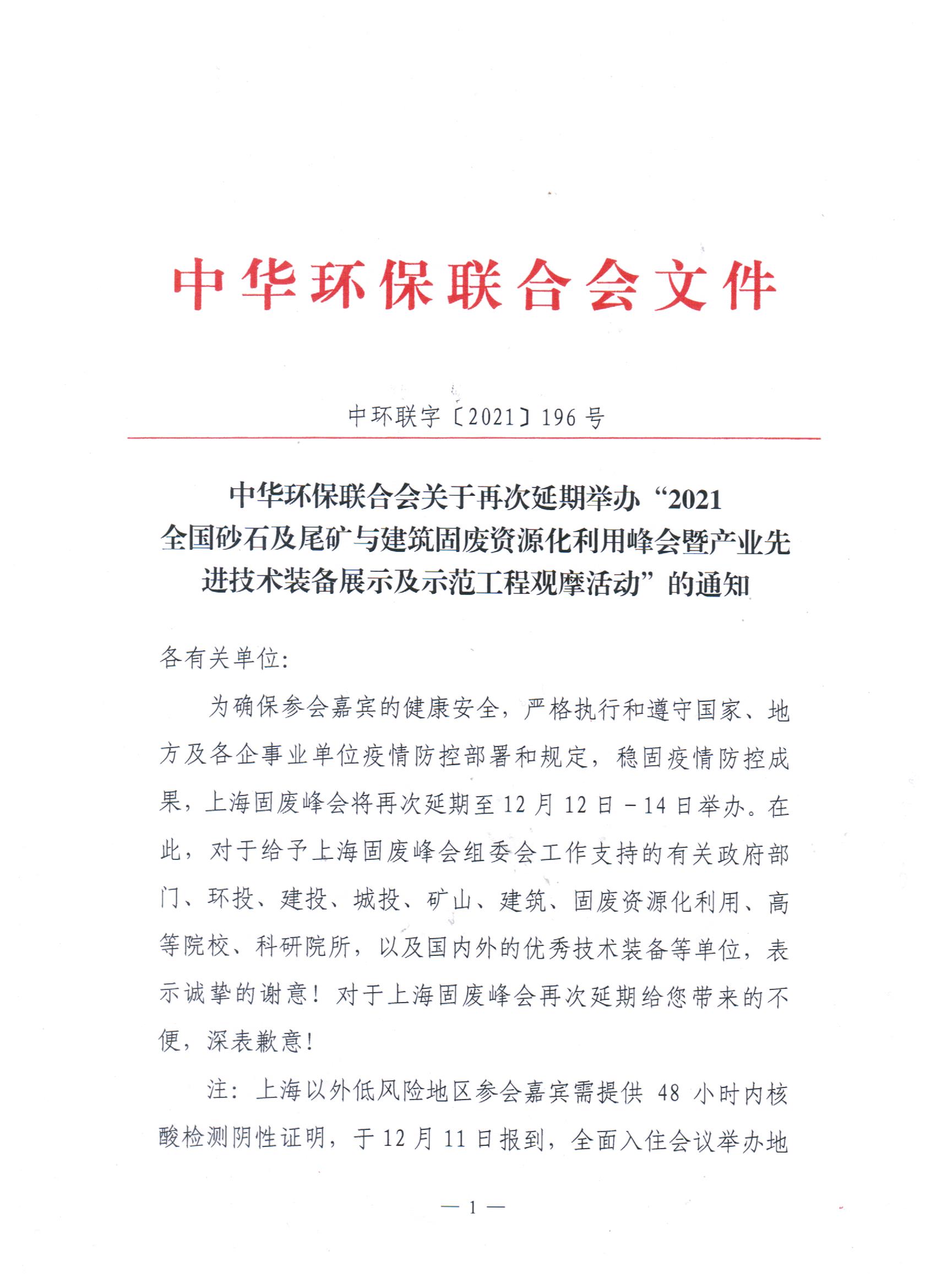 关于再次延期举办“2021全国砂石及尾矿与建筑固废资源化利用峰会暨产业先进技术装备展示及示范工程观摩活动”的通知
