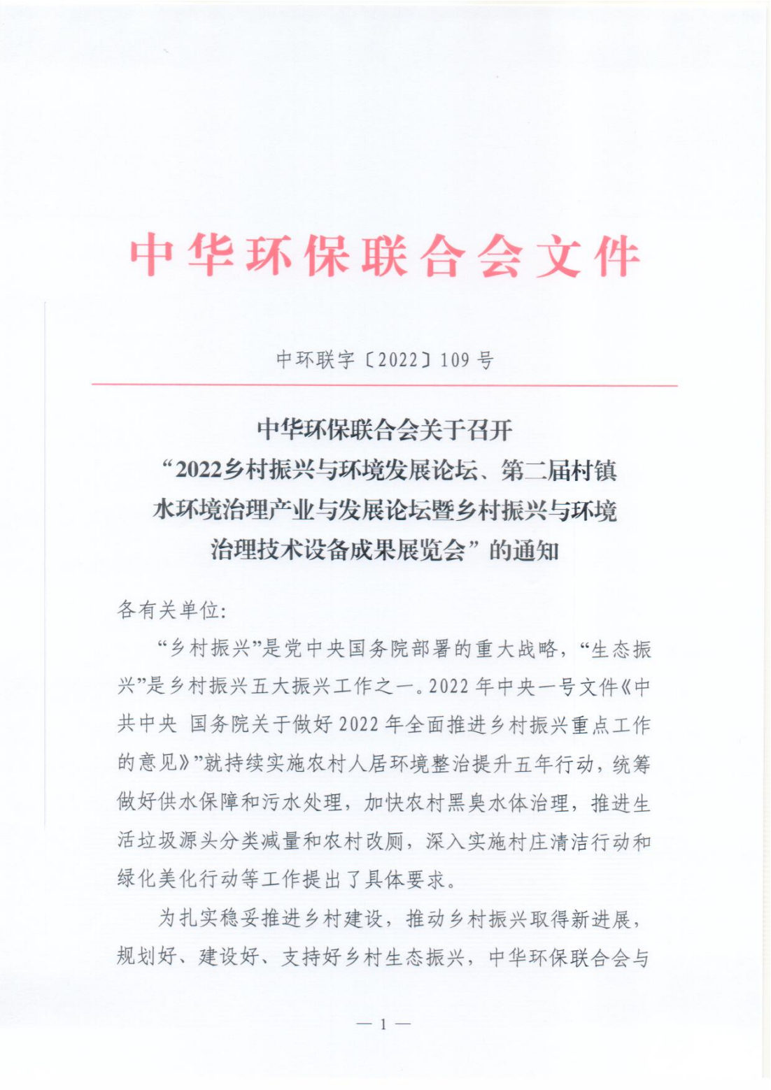 关于召开“2022乡村振兴与环境发展论坛、第二届村镇水环境治理产业与发展论坛暨乡村振兴与环境治理技术设备成果展览会”的通知