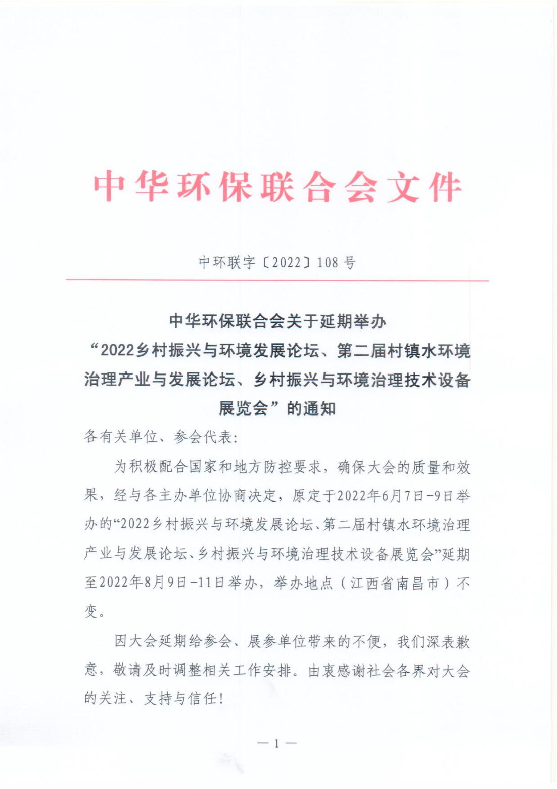 关于延期举办“2022乡村振兴与环境发展论坛、第二届村镇水环境治理产业与发展论坛、乡村振兴与环境治理技术设备展览会”的通知