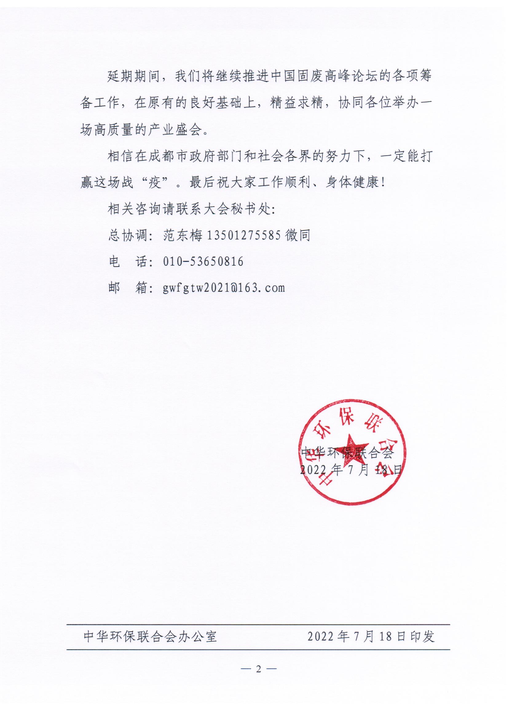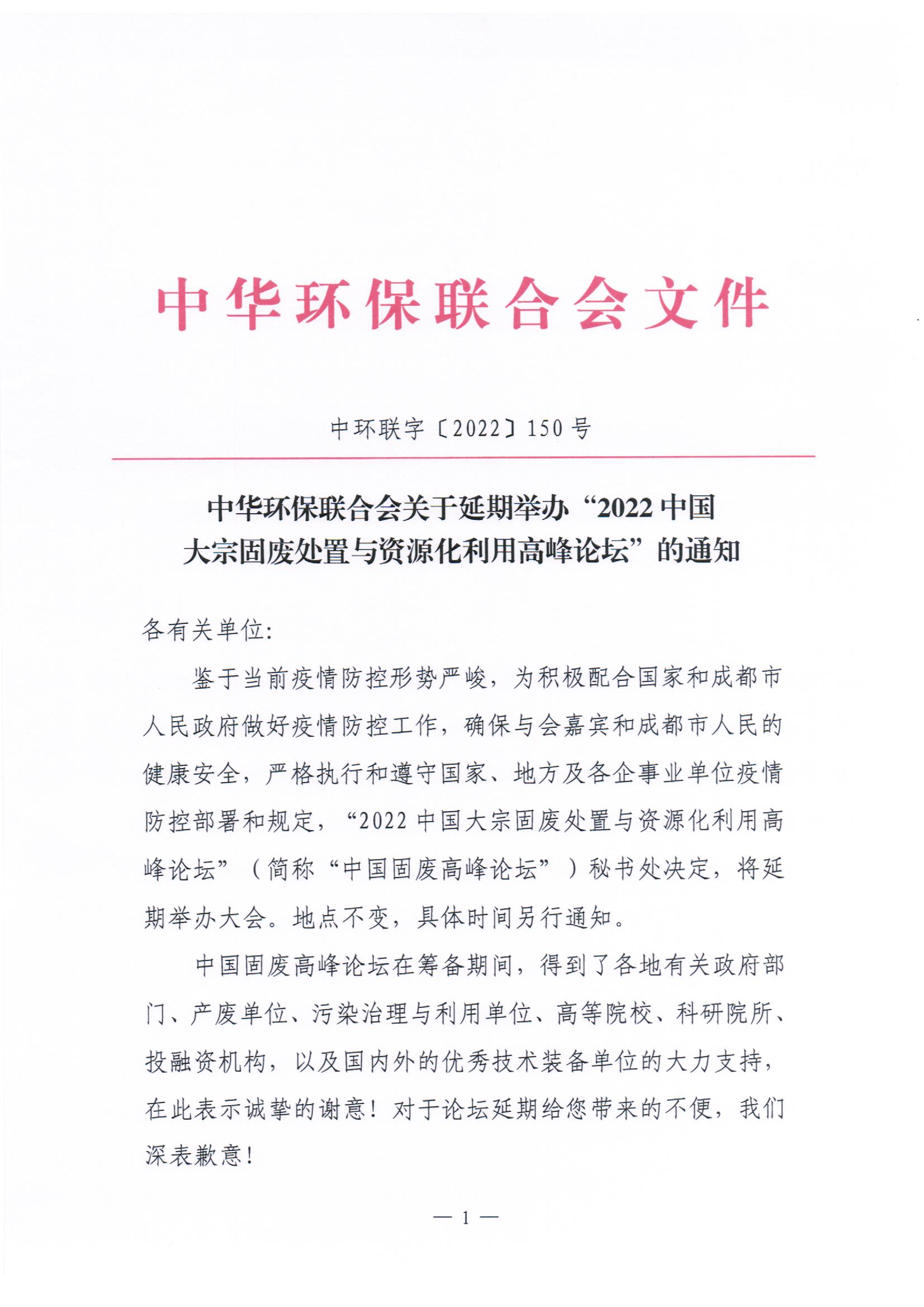 关于延期举办“2022中国大宗固废处置与资源化利用高峰论坛”的通知