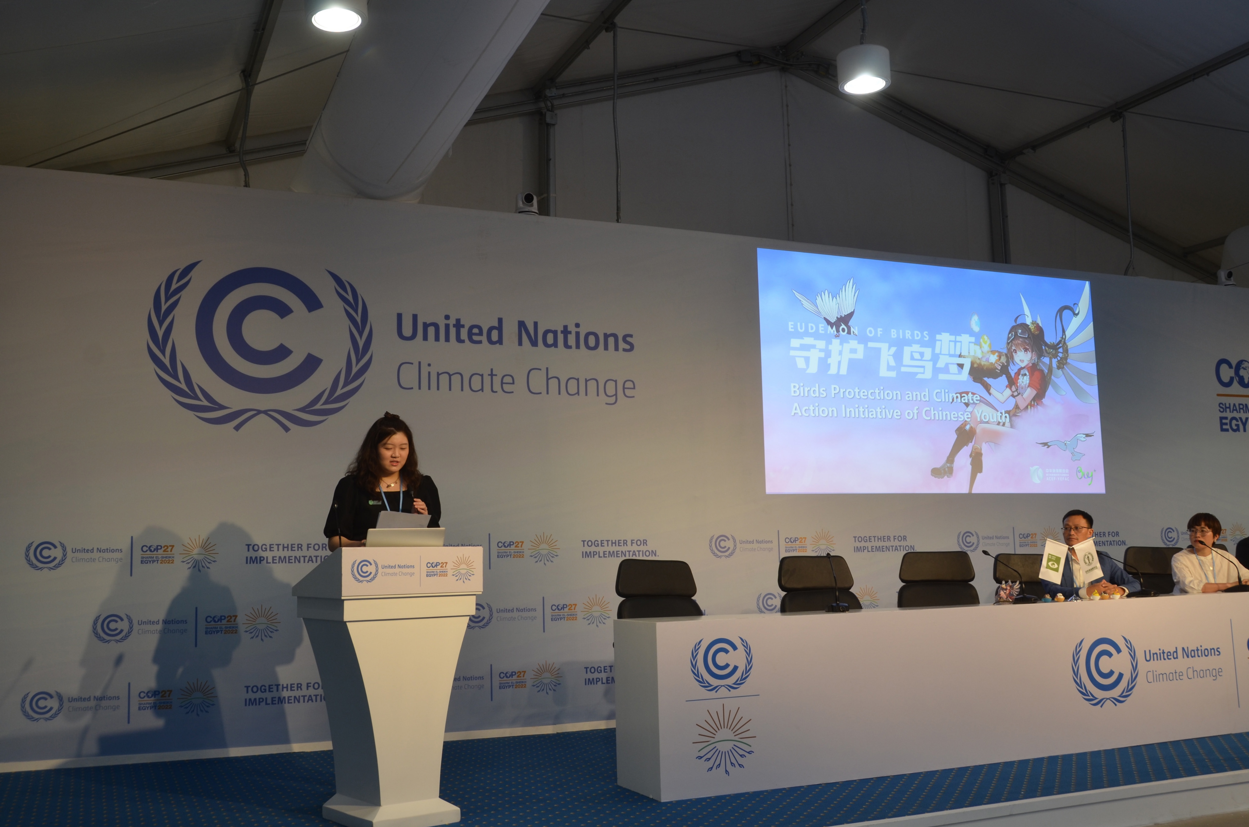 11月10日,中华环保联合会在第二十七届联合国气候变化框架公约缔约方大会(COP27)现场的新闻发布间举办了“生物多样性保护与应对气候变化协同”新闻发布会( Biodiversity Conservation and Tackling Climate Change-- Voices from Scientist and Youth Groups of China)新闻发布会上,中华环保联合会青少年环境友好行动委员会(以下简称“青少委”)与永续全球环境研究所(GEI)代表分别围绕气候变化与守护飞鸟、生物多样性金融工具和国际协作主题,面向现场参会机构和国际媒体进行了发布。
