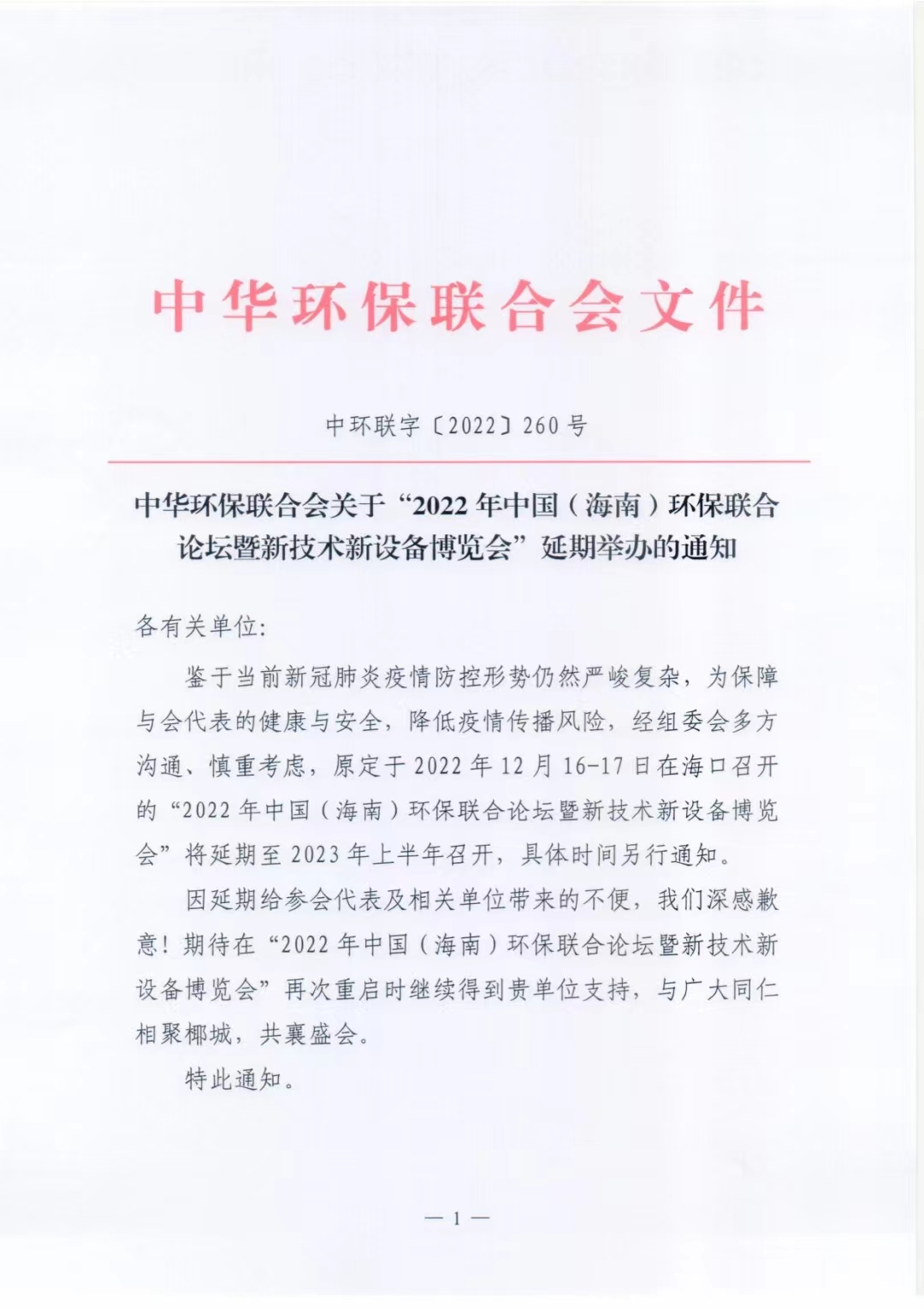 关于“2022年中国(海南)环保联合论坛暨新技术新设备博览会”延期举办的通知