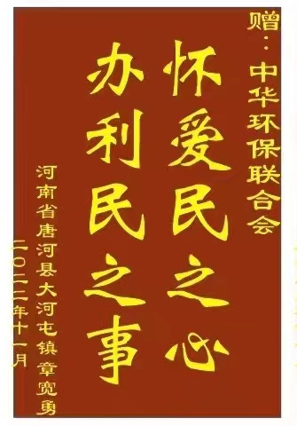 2022年12月1日,河南省唐河县大河屯镇郝马庄的章某将一面印有“怀爱民之心、办利民之事”的锦旗送到中华环保联合会,对中华环保联合会河南省办事处的法律援助律师维护其合法环境权益表示真诚感谢。