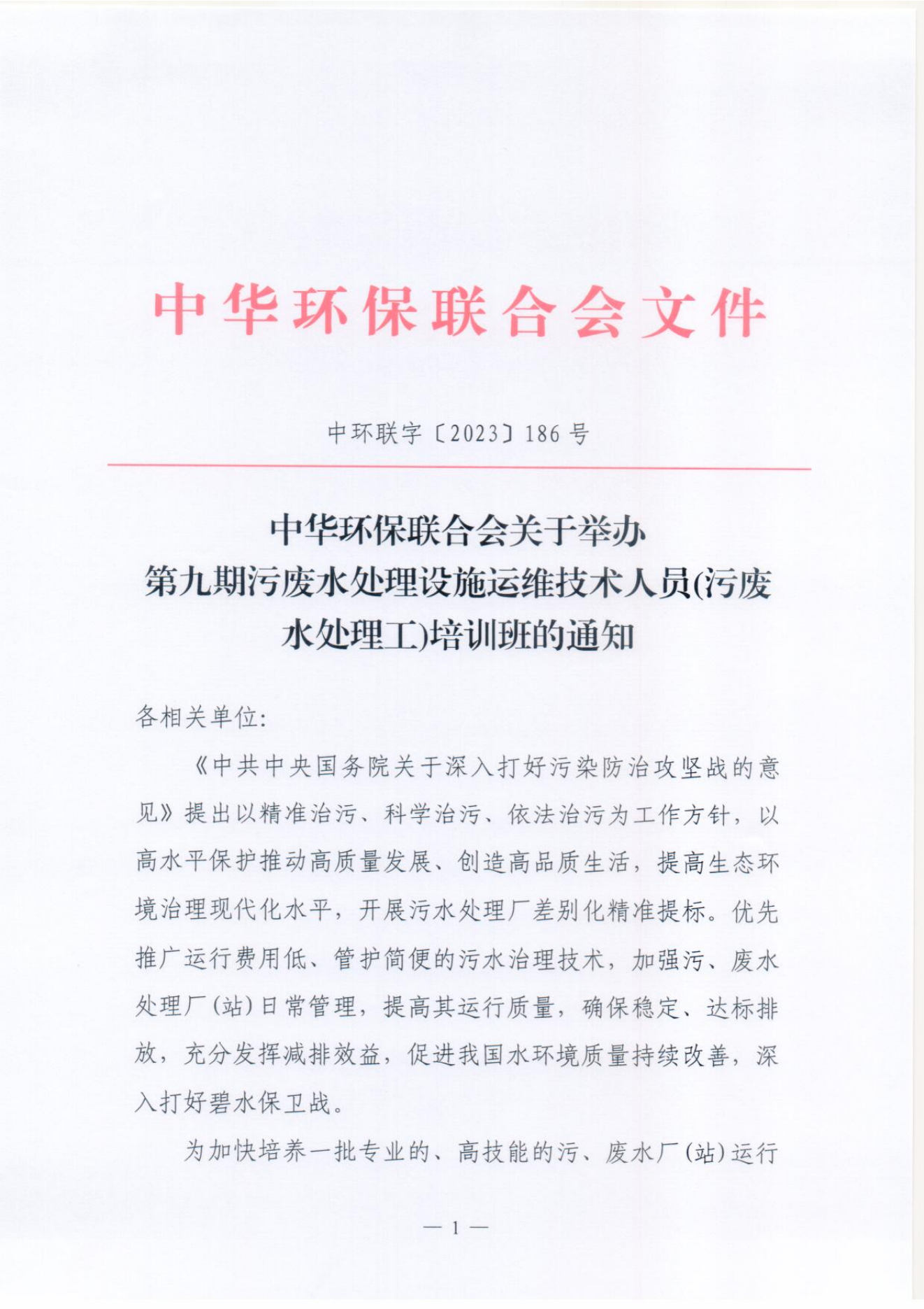 关于举办第九期污废水处理设施运维技术人员(污废水处理工)培训班的通知