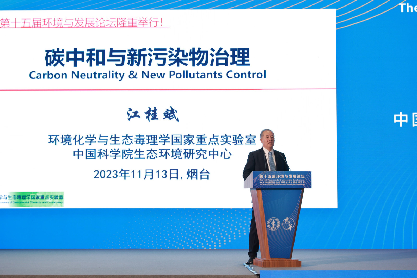 中国科学院院士、中国科学院生态环境研究中心研究员、环境化学与生态毒理学国家重点实验室主任江桂斌作报告。