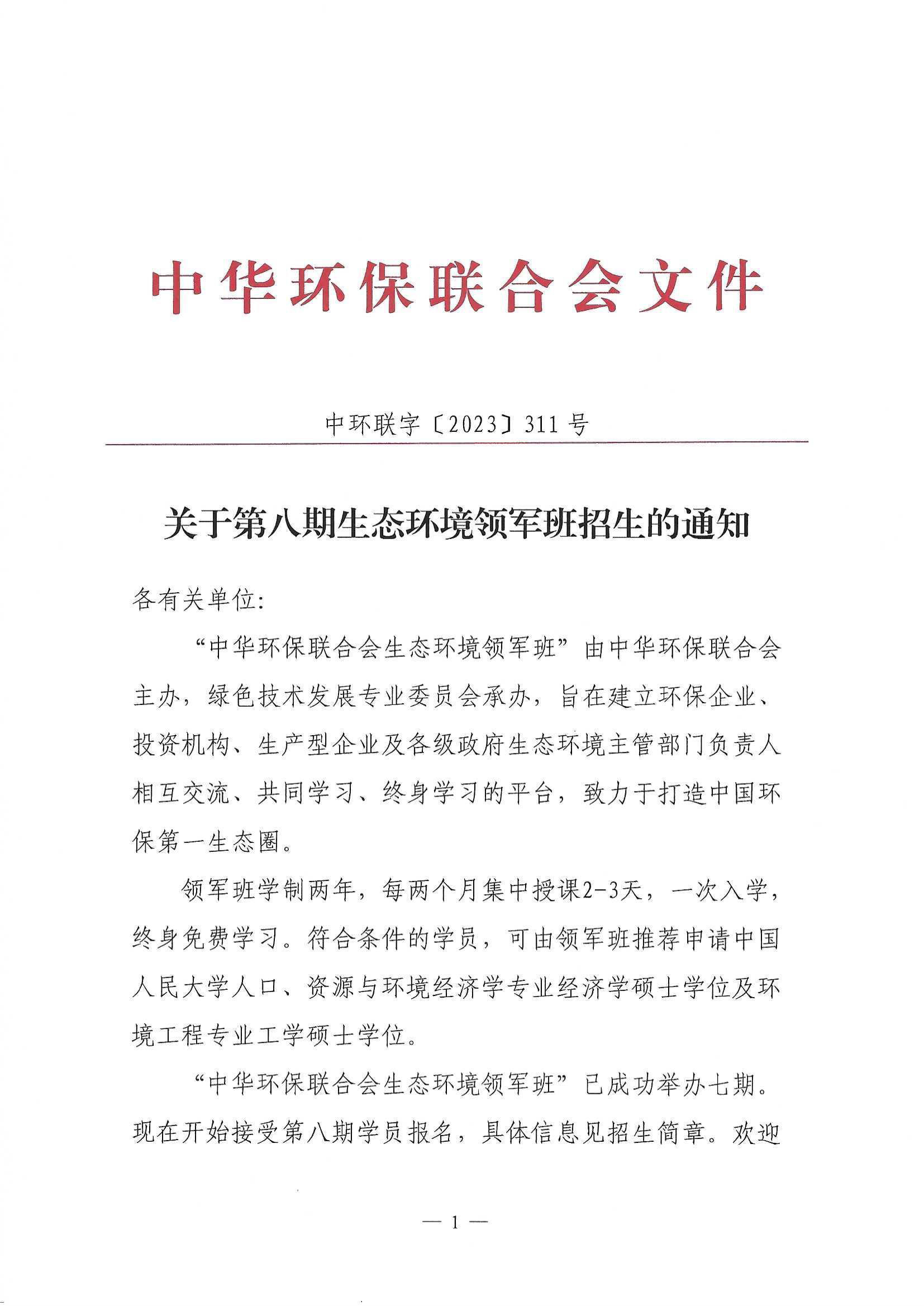关于第八期生态环境领军班招生的通知