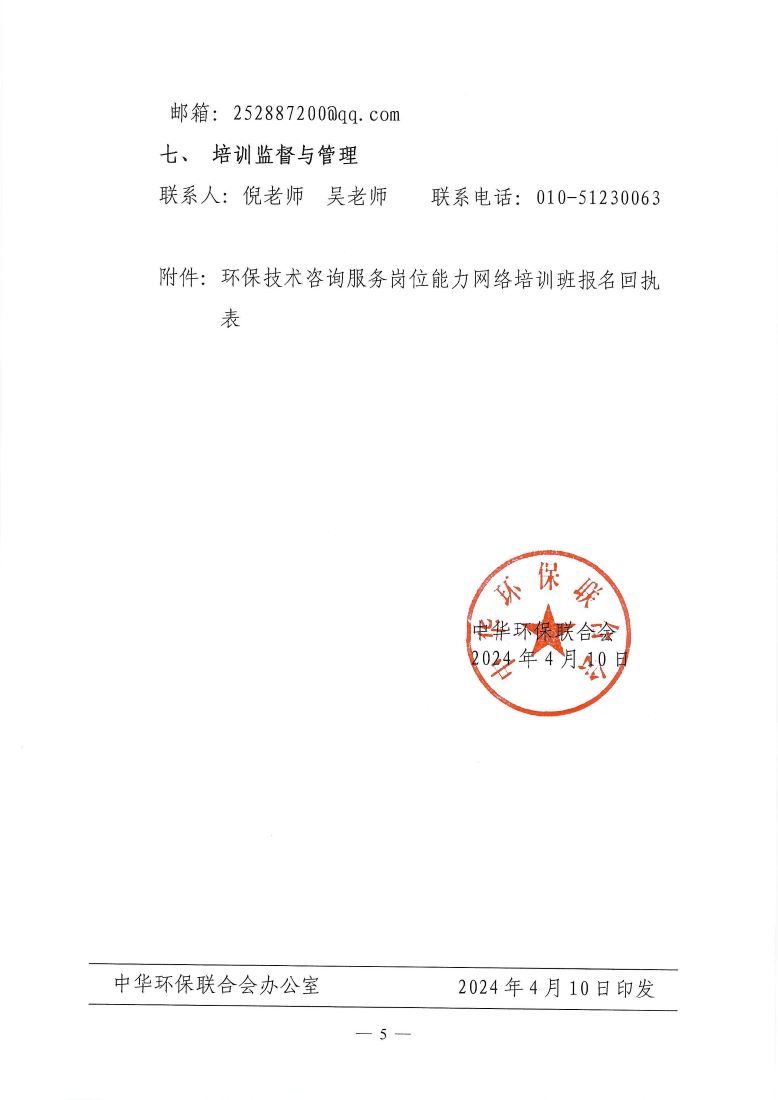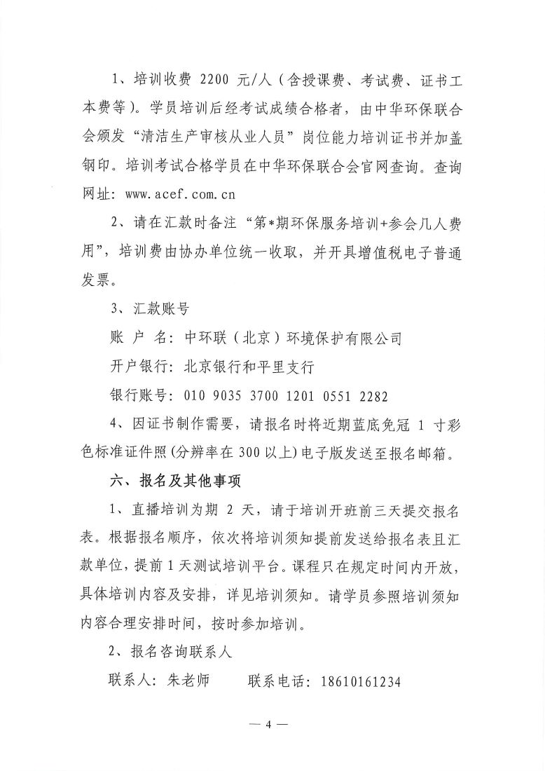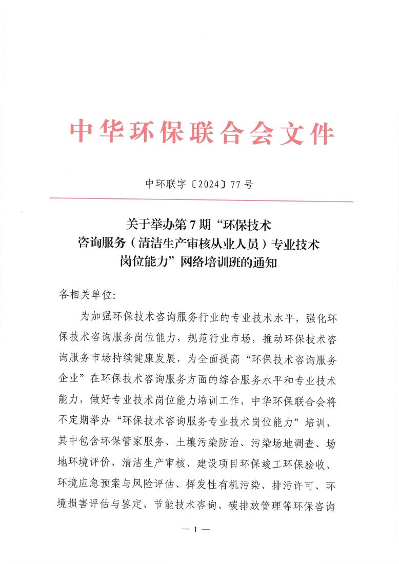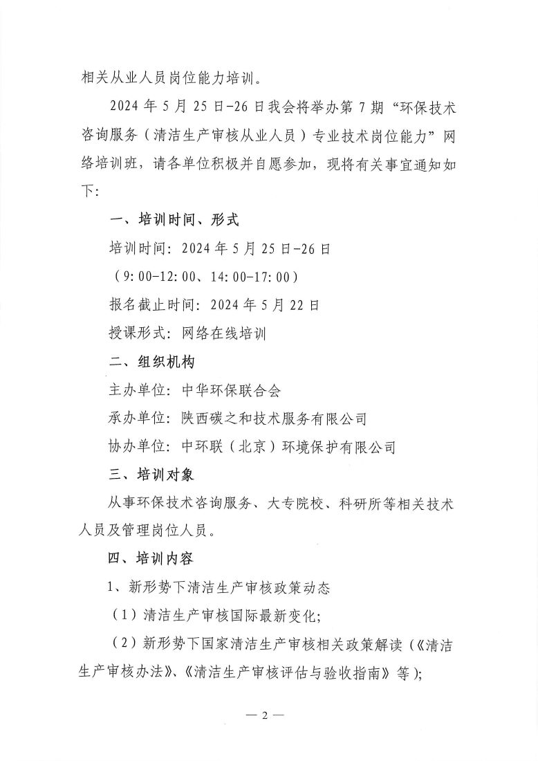 关于举办第7期“环保技术咨询服务(清洁生产审核从业人员)专业技术岗位能力”网络培训班的通知