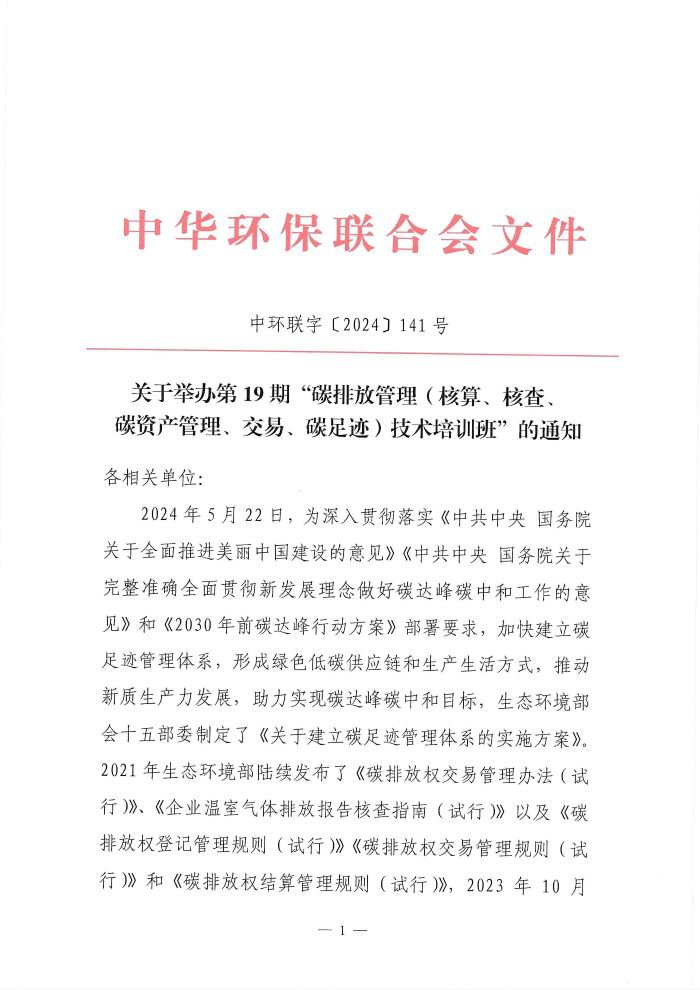 关于举办第19期“碳排放管理(核算、核查、碳资产管理、交易、碳足迹)技术培训班”的通知