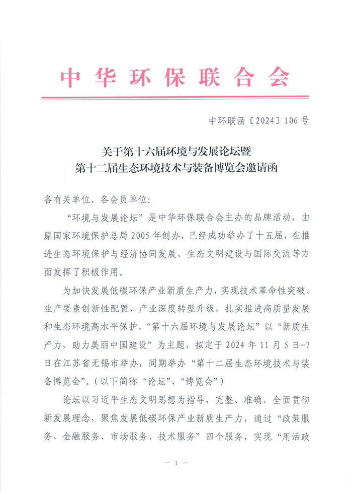 关于第十六届环境与发展论坛暨第十二届生态环境技术与装备博览会邀请函