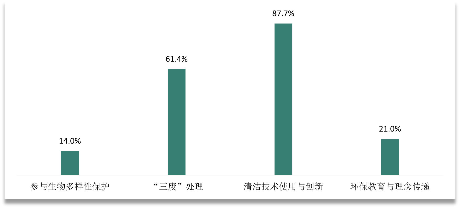 在气候应对与清洁技术创新方面,环保企业取得显著进展。《报告》显示,2024年,环保行业上市公司中有42.1%将“应对气候变化”列为企业的实质性议题,高于2023年的20%。此外,87.7%的环保企业积极推进清洁技术应用和创新,61.4%的企业采取“三废”处理措施,31%的企业开展环保培训及志愿活动,14%的企业参与生物多样性保护,展现出行业在绿色发展中的多元化实践。