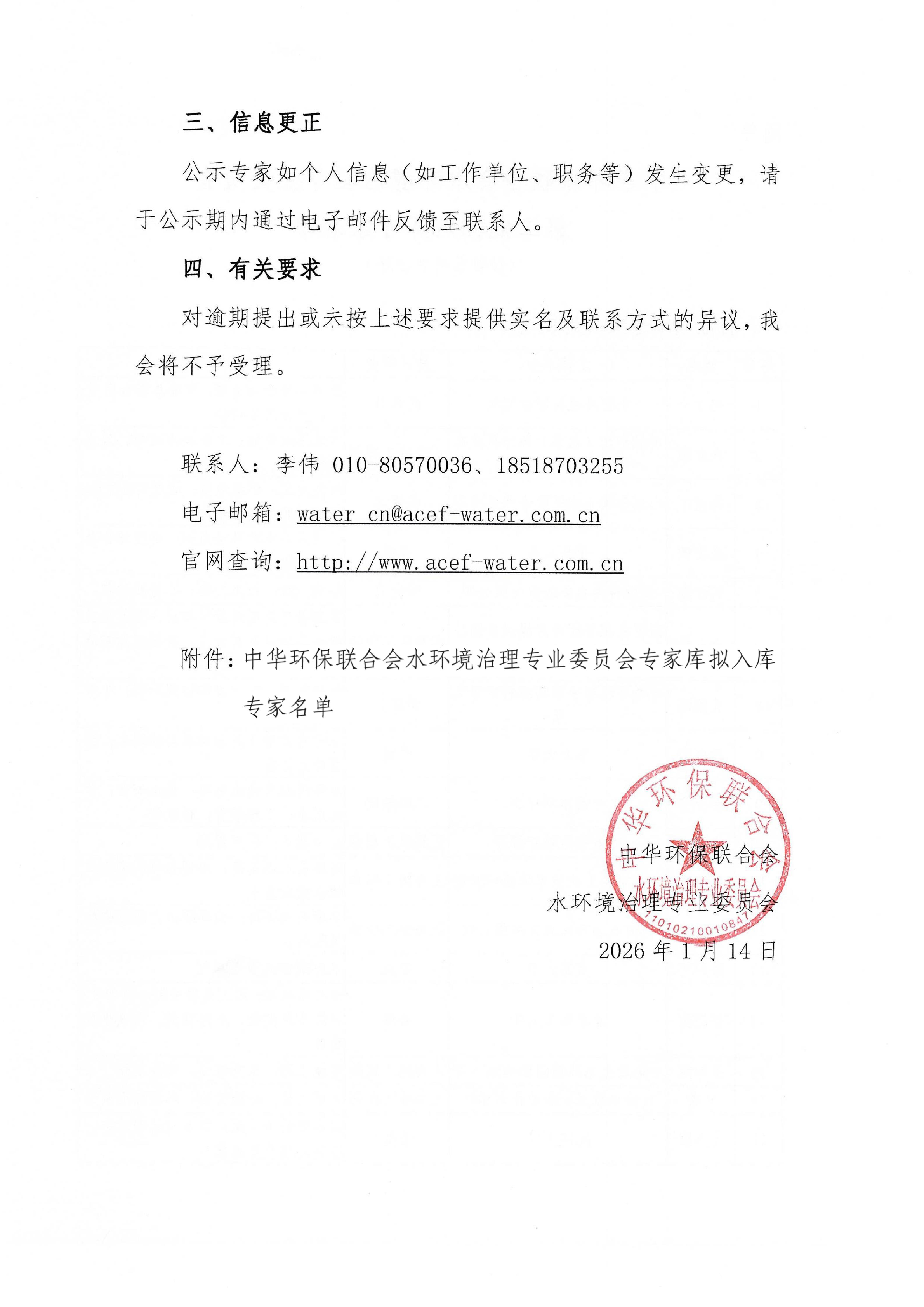 中华环保联合会水环境治理专业委员会专家库拟人库专家名单公示