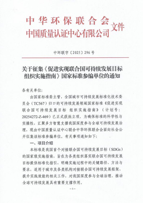 关于征集《促进实现联合国可持续发展目标 组织实施指南》国家标准参编单位的通知