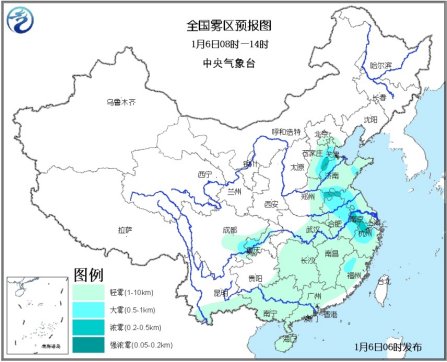 人民网北京1月6日电 (杨翼)今天早晨,河北南部、山东西南部、河南南部、浙江北部及四川盆地南部等地出现能见度不足1公里的大雾天气,预计这种天气状况将持续,中央气象台继续发布大雾黄色预警。而驻扎在西北地区的较强冷空气今起开始挥师南下,未来三天将给我国中东部带来大范围雨雪降温天气。