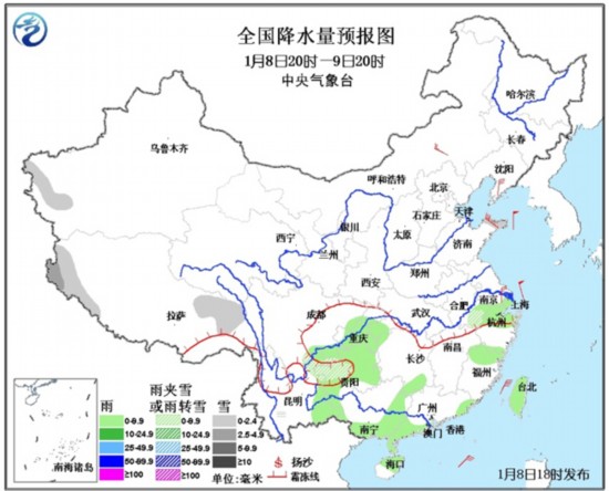 另外,10日开始,我国长江中下游及其以南地区自西向东又将会出现一次降水过程。大部地区以小到中雨为主,其中,贵州西部、江淮等地的部分地区将有雨夹雪天气。请上述地区的朋友们提前做好准备。