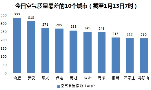 截至今天早上7时,合肥的AQI(空气质量指数)达到333,属于六级严重污染,成为目前161个参与空气质量排名的城市中空气质量最差的城市。今日空气质量最差的10个城市分别是合肥、武汉、绍兴、保定、芜湖、杭州、菏泽、邯郸、石家庄、马鞍山,其中安徽省参与空气质量排行的3个城市都上榜,分别是合肥、芜湖、马鞍山。